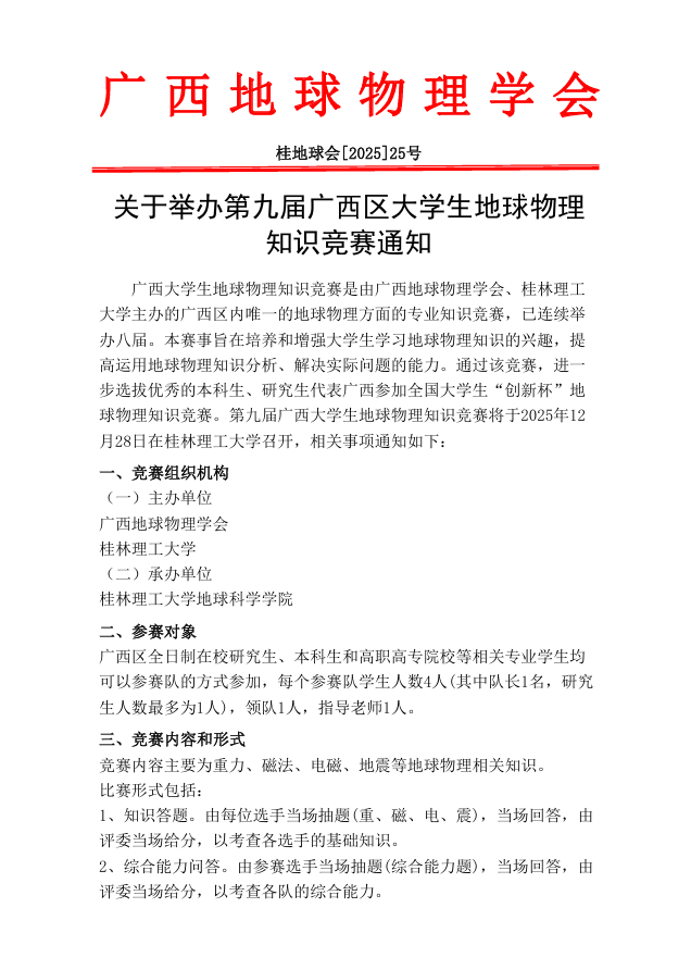 关于举办第九届广西区大学生地球物理知识竞赛通知-桂地球会[2025]25号